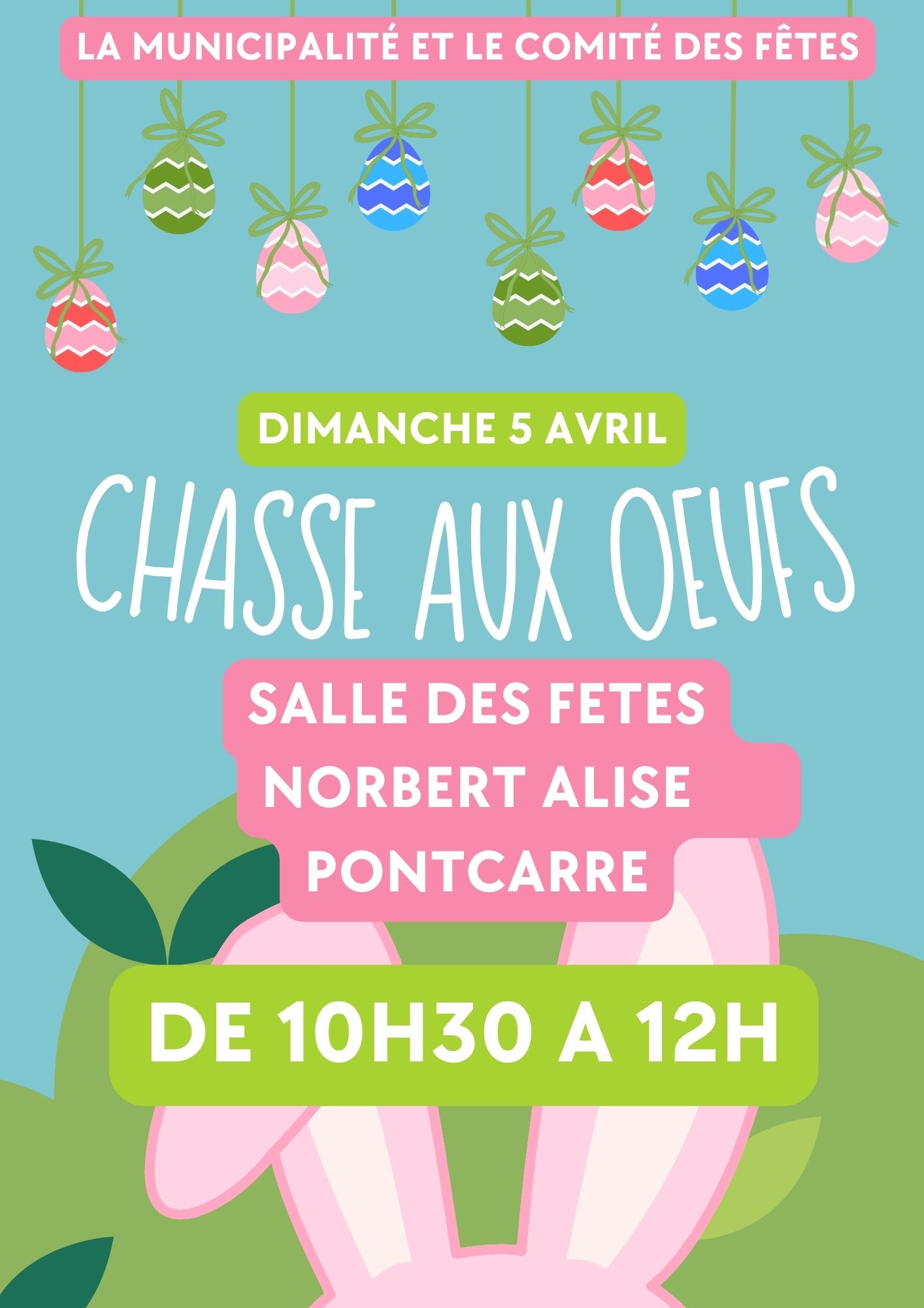 Ce dimanche 5 avril 2026, la chasse aux œufs aura lieu à la salle des fêtes Norbert Alisé de 10h30 à 12h00.